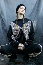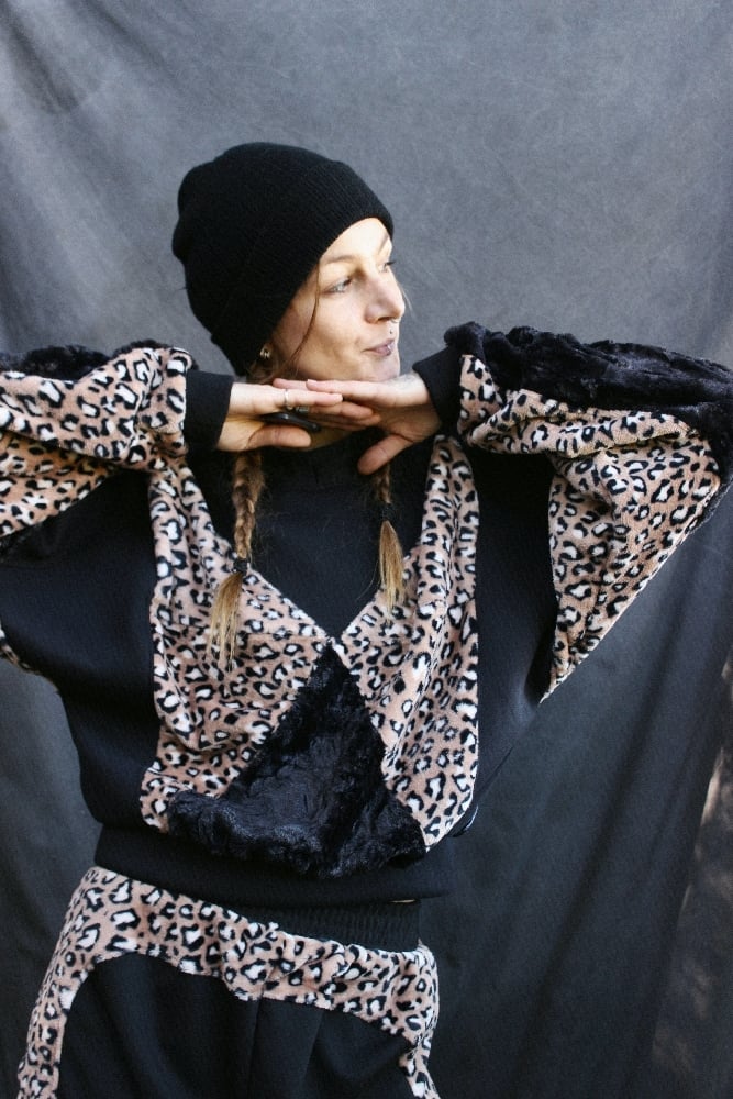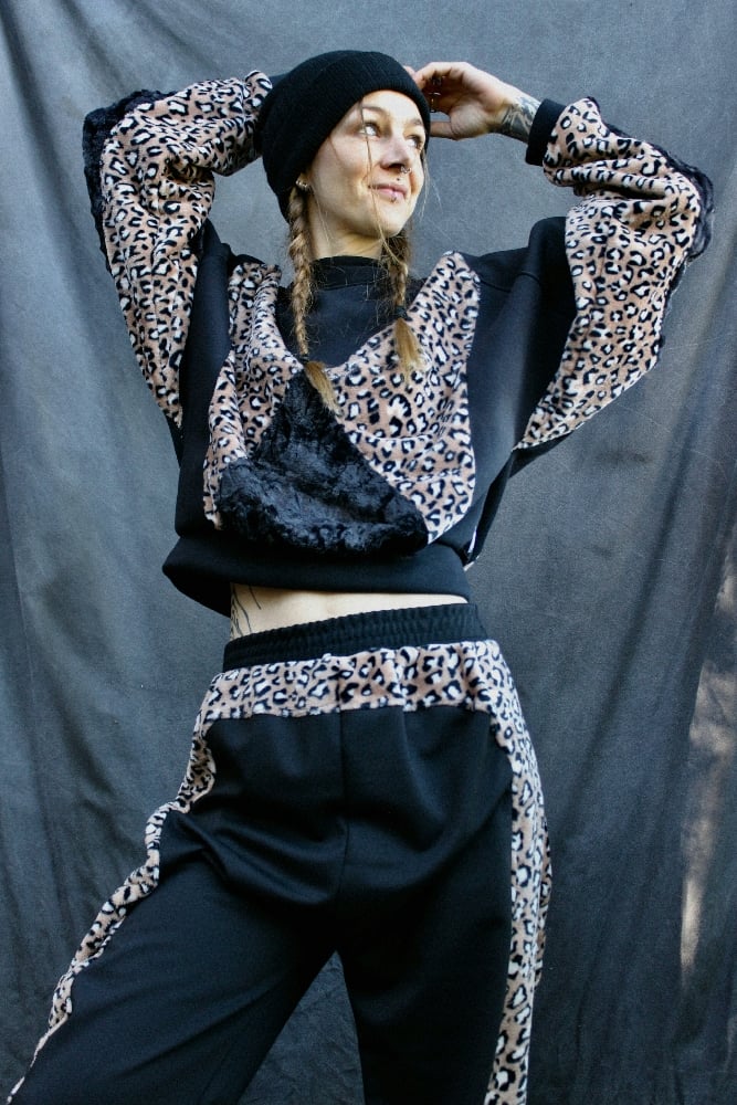 A RAYA hoodie made from a thick black fleece cotton, detailed with a black faux fur and a leopard fluff pattern.