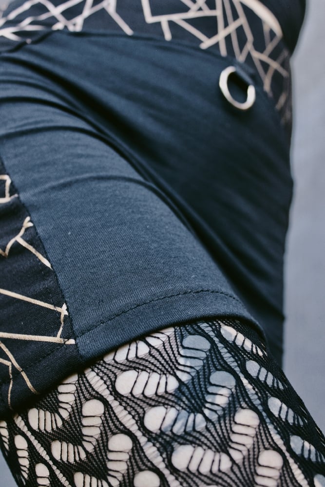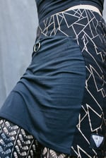 A RAYA skirt, crafted from a black cotton stretxh detailed with a golden triangle pattern.