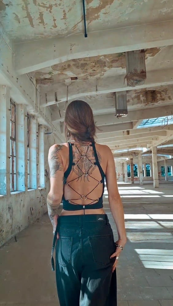 A SYRA Top made from a black synthetic stretch detailed with a tiger pattern. The back is detailed with rings and a rubber band.