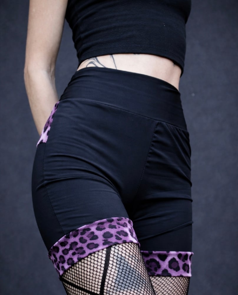 Yara shorts made from a black stretch detailed with a purple leopard pattern.